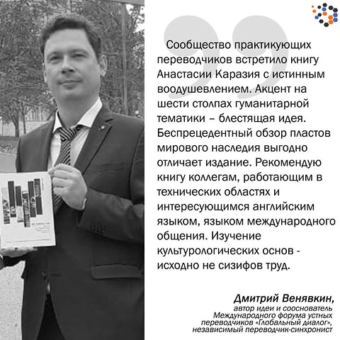 Учебное пособие к.филол.н, старшего преподавателя факультета иностранных языков СПбГУ А. Каразия "#НЕ_СИЗИФОВ_ТРУД" будет полезно не только преподавателям перевода и их студентам, но и практикующим переводчикам. Своим профессиональным мнением о книге поделился Дмитрий Венявкин, автор идеи и сооснователь Международного форума устных переводчиков «Глобальный диалог», независимый переводчик-синхронист: "Сообщество практикующих переводчиков встретило книгу Анастасии Каразия с истинным воодушевлением. Акцент на шести столпах гуманитарной тематики – блестящая идея. Беспрецедентный обзор пластов мирового наследия выгодно отличает издание. Рекомендую книгу коллегам, работающим в технических областях (нефтехимия, инжиниринг и нефтегазовый сектор) и интересующимся английским языком, языком международного общения. Изучение культурологических основ - исходно не сизифов труд".
