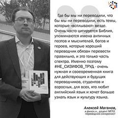 Алексей Маганов, к.филол.н., доцент Московского государственного лингвистического университета, переводчик-синхронист: "Где бы мы ни переводили, что бы мы ни переводили, есть темы, которые «всплывают» везде. На конференциях по образованию и медицине, нефти и газу, компьютерным и любым прорывным технологиям, очень часто цитируется Библия, упоминаются имена античных поэтов и мыслителей, богов и героев, которые хороший переводчик обязан перевести правильно, и это только часть спектра. Политика, искусство, кино – темы, встречающиеся переводчику не только на конференциях, но и при переводе переговоров, тостов, выступлений. – еще одна важная тема, которая может «попасться» переводчику не только на конференциях, но и при переводе переговоров, тостов, выступлений. Именно поэтому #НЕ_СИЗИФОВ_ТРУД - очень нужная и своевременная книга. Для кого?Прежде всего, это отличное пособие для действующих и будущих переводчиков. Но не только. Книга подойдет для студентов и взрослых, для всех, кто любит английский язык и хочет больше узнать язык и культуру языка. Моим студентам книга очень понравилась, и я планирую и в дальнейшем использовать ее на своих занятиях в качестве дополнительного материала".